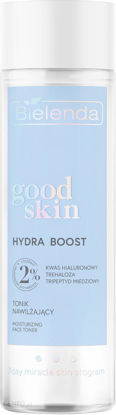 Już dziś przystąp do 7 day miracle skin program i sprawdź na własnej skórze znakomite efekty, które przyniesie stosowanie produktów z linii Bielenda Good Skin.Tonik działa odświeżająco i nawilżająco, doskonale przygotowuje cerę do dalszej pielęgnacji, przyjęcia serum lub kremu. Przywraca komfort Twojej skóry, który mógł zostać zaburzony podczas jej mycia. Produkt nie narusza naturalnej równowagi hydrolipidowej naskórka.Bogate wnętrze naszego toniku – przekonaj się jak dobrze może wyglądać Twoja skóra!Kwas hialuronowy – jest jednym z najlepszych składników kosmetycznych chroniących skórę przed wysuszaniem naskórka, bardzo intensywnie go nawilża.Trehaloza – redukuje utratę wody w skórze, a do tego wykazuje właściwości antyoksydacyjne, odmładzające i wzmacniające, dodatkowo chroni przed szkodliwymi czynnikami zewnętrznymi.Tripeptyd miedziowy – składnik cud, wiele badań klinicznych potwierdza jego działanie przeciwstarzeniowe, redukujące zmarszczki oraz poprawiające elastyczność, jędrność i napięcie skóry.Wow! już po tygodniu stosowania zauważysz*:- poprawę nawilżenia skóry o 24%- poprawę jędrności skóry o 14%- poprawę elastyczności skóry o 12%- wyrównanie kolorytu skóry o 3%* Skuteczność potwierdzona w programie badań aparaturowych. Efekty widoczne przy stosowaniu toniku wraz z kremem i serum z linii Hydra Boost przez 7 dni.
