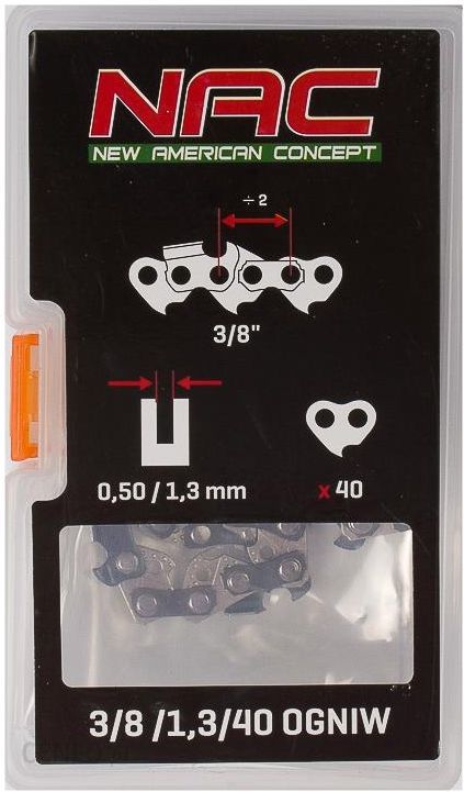 Łańcuch do piły NAC 10 TT-CS2500 40ROryginalny łańcuch tnący m.in. do pilarek NAC CS2500, CST25-25AC oraz do urządzenia wielofunkcyjnego NAC WLBC305A Został wykonany z wykorzystaniem najnowszych technologi oraz najlepszych materiałów. Bardzo wytrzymały na tępienie oraz rozciąganie. Dodatkowo wzmocnione spinki ogniw zapobiegają zerwaniu podczas pracy.LOW KICKBACK – system antyodbiciowy – specjalny kształt zęba tnącego chroni podczas cięcia przed odbiciem prowadnicy.Dane techniczne:dla prowadnicy: 25,4 cm / 10”skok: 3/8” (19.5 mm)szerokość ogniwa prowadzącego: 1,3 mm (0,050”)ilość ogniw prowadzących: 40Pasuje m.in do pilarek NAC:TT-CS2500CST25-25ACoraz do urządzenia wielofunkcyjnego:WLBC305A
