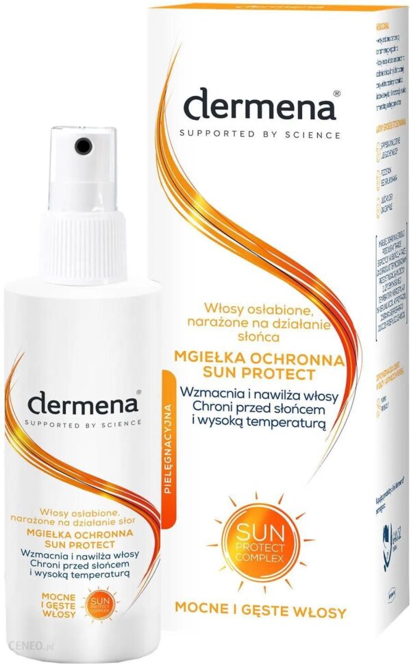 Mgiełka ochronna Dermena SUN PROTECT stosowana regularnie przez 3 tygodnie: wzmacnia i nawilża włosy chroni przed słońcem i wysoką temperaturą chroni kolor włosów przed blaknięciem ma właściwości regenerujące i naprawcze zmniejsza łamliwość włosów i rozdwajanie się końcówek odżywia i wyraźnie nawilża włosy nie obciąża i nie przesusza włosów Wskazania: włosy osłabione, z tendencją do nadmiernego wypadania każdy rodzaj włosów narażonych na działanie słońca, słonej i chlorowanej wody, wiatru oraz innych czynników środowiskowych tj. klimatyzacja, wysoka temperatura, suche powietrze Pojemność: 200ml MAMA FRIENDLY – Odpowiedni dla kobiet w ciąży i karmiących piersią.