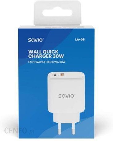 Ładowarka sieciowa Savio LA-06 USB Quick Charge Power Delivery 3.0 30W Informacje dodatkowe 5V?3A (15W), 9V?3A (27W), 12V?2.5A (30W), 5V?3A (15W), 9V?3A (27W), 12V?2.5A (30W), 15V?2A (30W), 20V?1.5A (30W), Całkowita wydajność dla portu USB-A + PD: maks. 20W (5V?4A), Kompatybilność ze wszystkimi smartfonami, tabletami itp., Napięcie wejściowe: 100-240V~, 50/60Hz, 0,85A, Napięcie wyjściowe dla portu Power Delivery 3.0, Napięcie wyjściowe dla portu USB-A (Quick Charge 3.0), Porty: 1 x USB-A, 1 x PD, Zabezpieczenie: przeciążeniowe, przeciwzwarciowe i przeciwprzegrzaniowe, Zawartość zestawu: ładowarka sieciowa, instrukcja obsługi