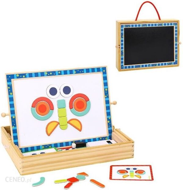 TOOKY TOY Puzzle Magnetyczne Kształty to idealny pomysł na prezent dla dziecka od 3 roku życia. Zestaw zawiera drewnianą podkładkę na której umieszcza się dwustronną tablicę. Z jednej strony znajduje się tablica kredowa, a z drugiej magnetyczna. Te dwie funkcje tablicy zachwycą każdego malucha. Tablice można złożyć jak wygodną walizkę/torbę z uchwytem. Dziecko może korzystać według własnych upodobań i chęci. Kolory i kształty klocków pozwolą na kreatywną zabawę. W zestawie zawierają się również 30 wzory do ułożenia z klocków dla dziecka z różnymi poziomami trudności. Ta tablica na pewno pobudzi wyobraźnie naszego malucha. Frajda gwarantowana !CHARAKTERYSTYKA:- dwustronna tablica: kredowa i magnetyczna- zestawie: dwustronna tablica, kreda, klocki, gąbeczka do zmywania oraz 30 wzorów układanek- wzory posiadają 3 poziomy trudności- można złożyć jak wygodną walizkę/torbę z uchwytem- tablica wykonana z drewna o wysokiej jakości- bezpieczna w 100% dla dzieckaZABAWKA ROZWIJA:- umiejętność rozróżniania kształtów i kolorów- kreatywność- wyobraźnie- zdolności motoryczne- zdolności artystyczne- wiedzę na temat zasad fizykiTooky Toy to firma produkująca drewniane zabawki dla dzieci, obecna na rynku od 2004 roku. Kilkanaście lat doświadczenia w branży to gwarancja wysokiej jakości produktów, wytwarzanych z myślą o bezpieczeństwie dzieci. Zabawki Tooky Toy posiadają liczne certyfikaty potwierdzające bezpieczeństwo tych ekologicznych produktów. Dobrze wygładzone, wolne od drzazg i ostrych krawędzi zabawki, pokryte są wyłącznie bezpiecznymi, nietoksycznymi farbami, barwnikami i lakierami. To wszystko sprawia, że zabawki Tooky Toy są uwielbiane przez dzieci i doceniane przez rodziców na całym świecie.